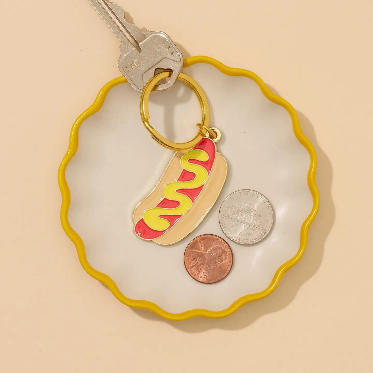 Bite-sized fun for your keys! This adorable soft enamel hotdog keychain brings a dash of whimsy to your everyday carry. Measuring a perfect 2", it's the ideal size for bags, backpacks, or key rings. Featuring vibrant artwork by Meghan Hopkins Sokorai, each piece is thoughtfully designed and packaged in Columbus, OH, then expertly crafted in Taiwan. A deliciously charming accessory that's sure to spark smiles.