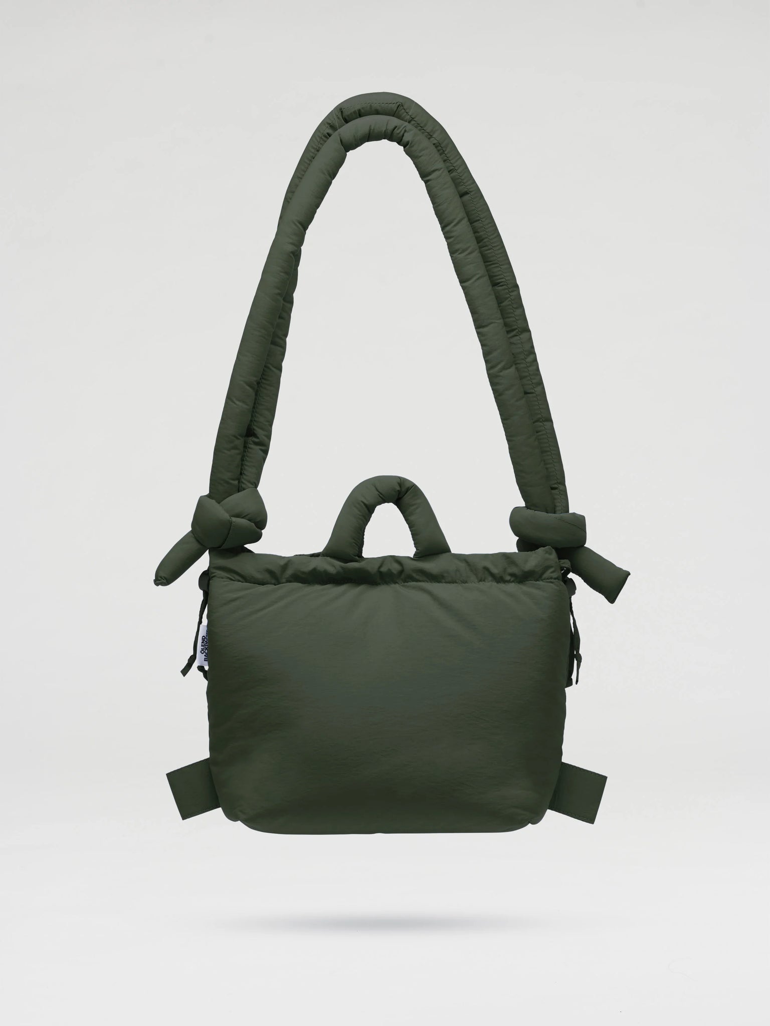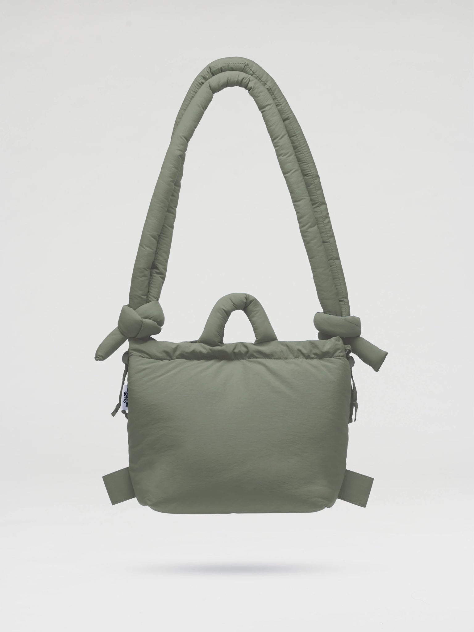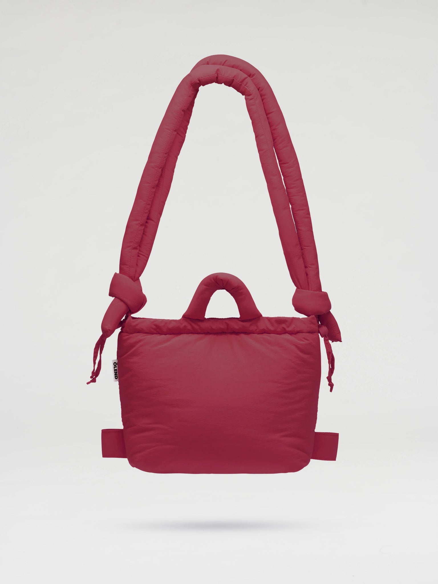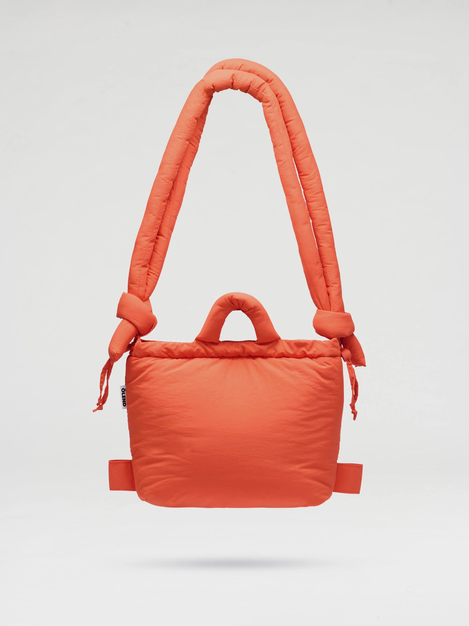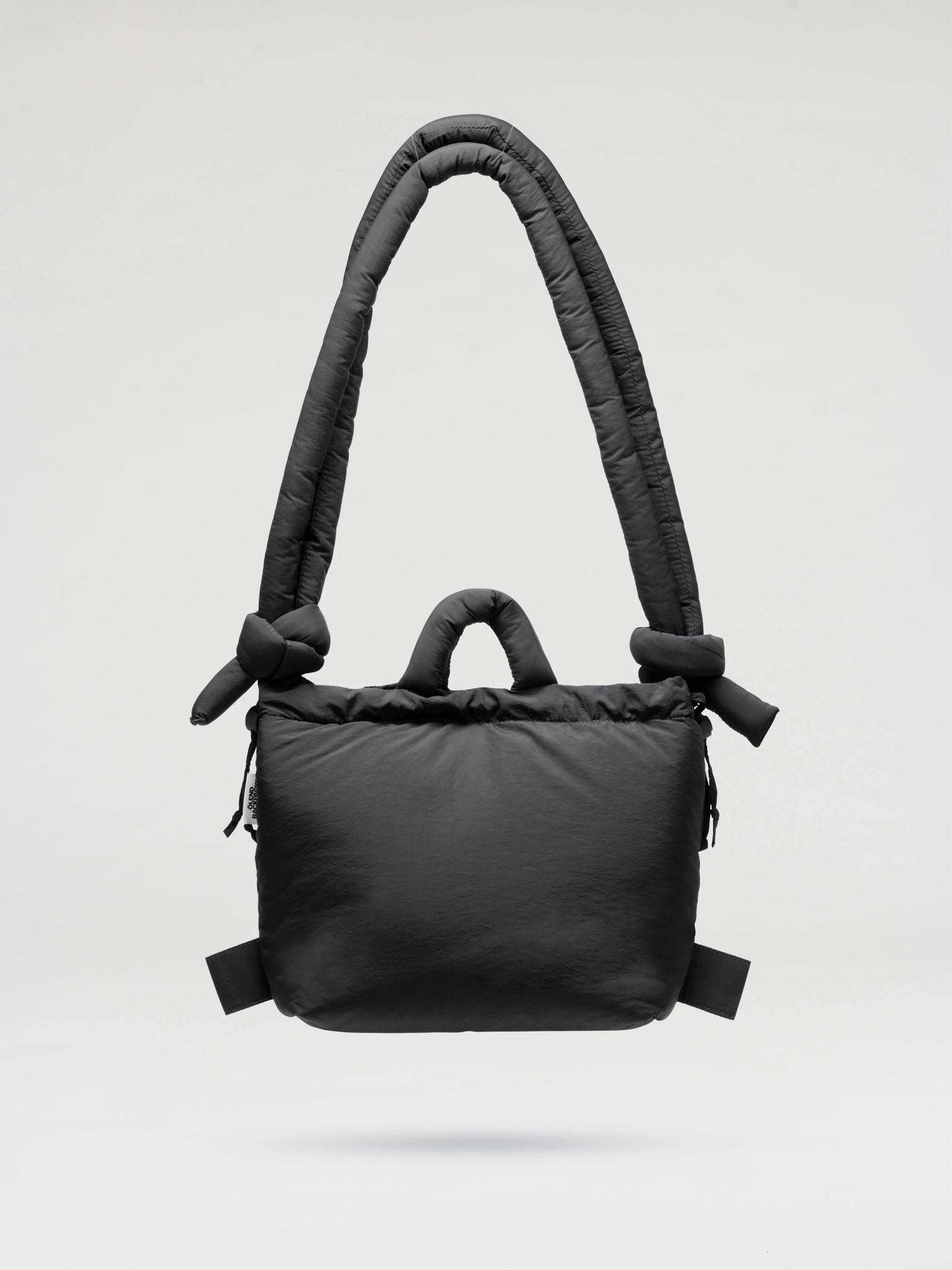 A soft, padded bag with a unique design. Made of a lightweight padded fabric, giving it a cushioned look. The bag has two puffy straps that can be converted into a backpack. It's designed to hold a fair amount of items (including a 14" laptop)while maintaining a chic, minimalist aesthetic.