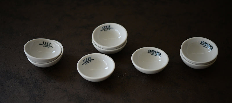 Lovely little bowls made for enjoying the art of cooking from preparation of ingredients. The names of the spices are printed by copper stencil transfer technique.