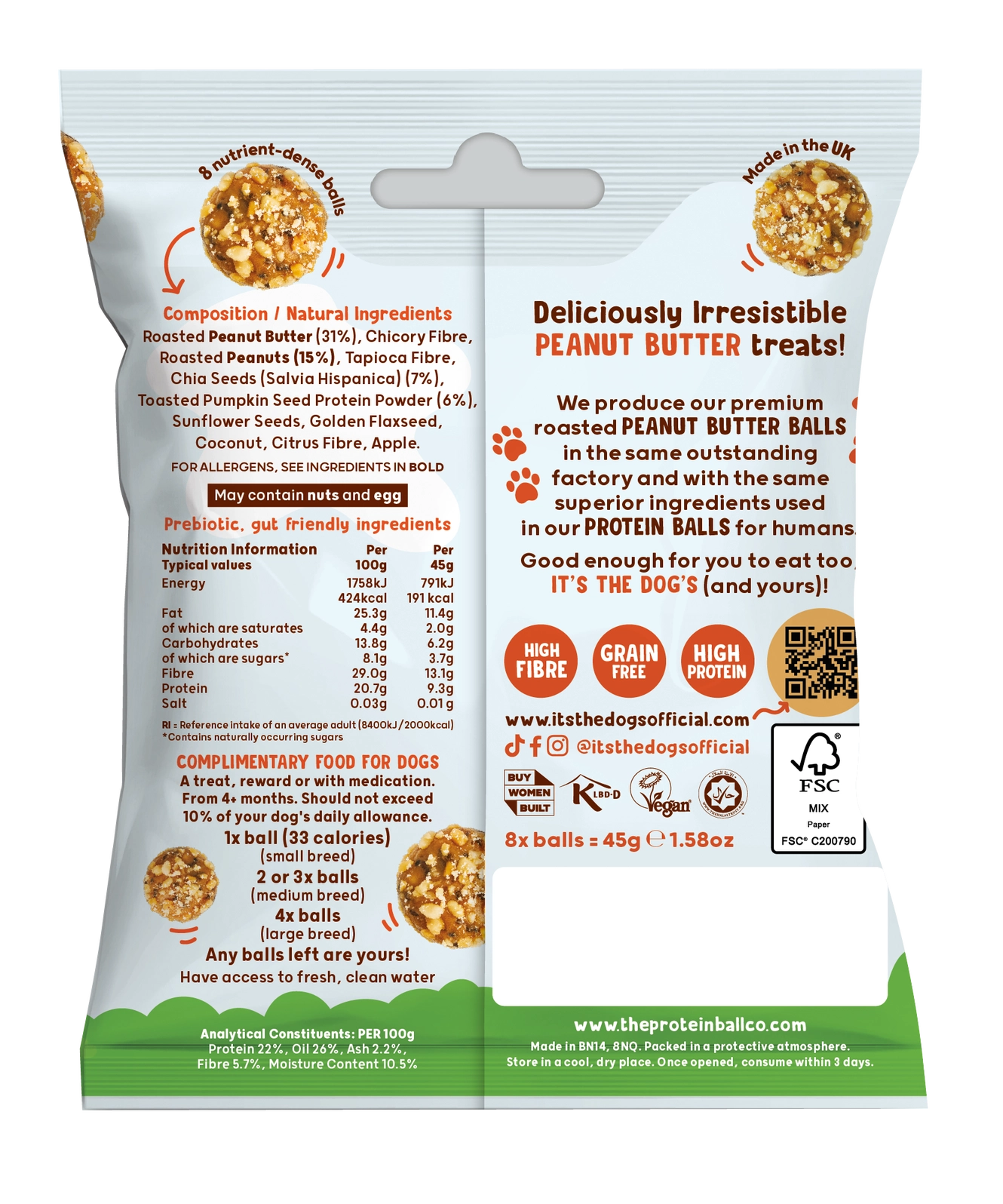 These deliciously irresistible Peanut Butter Dog Balls with Chia and Pumpkin are the perfect all-natural, grain-free treat. Made with peanut butter for a boost of protein and healthy fats, chia seeds for omega-3s that support a shiny coat and strong joints, and pumpkin to aid digestion, these treats offer a tasty way to support your dog’s overall health.