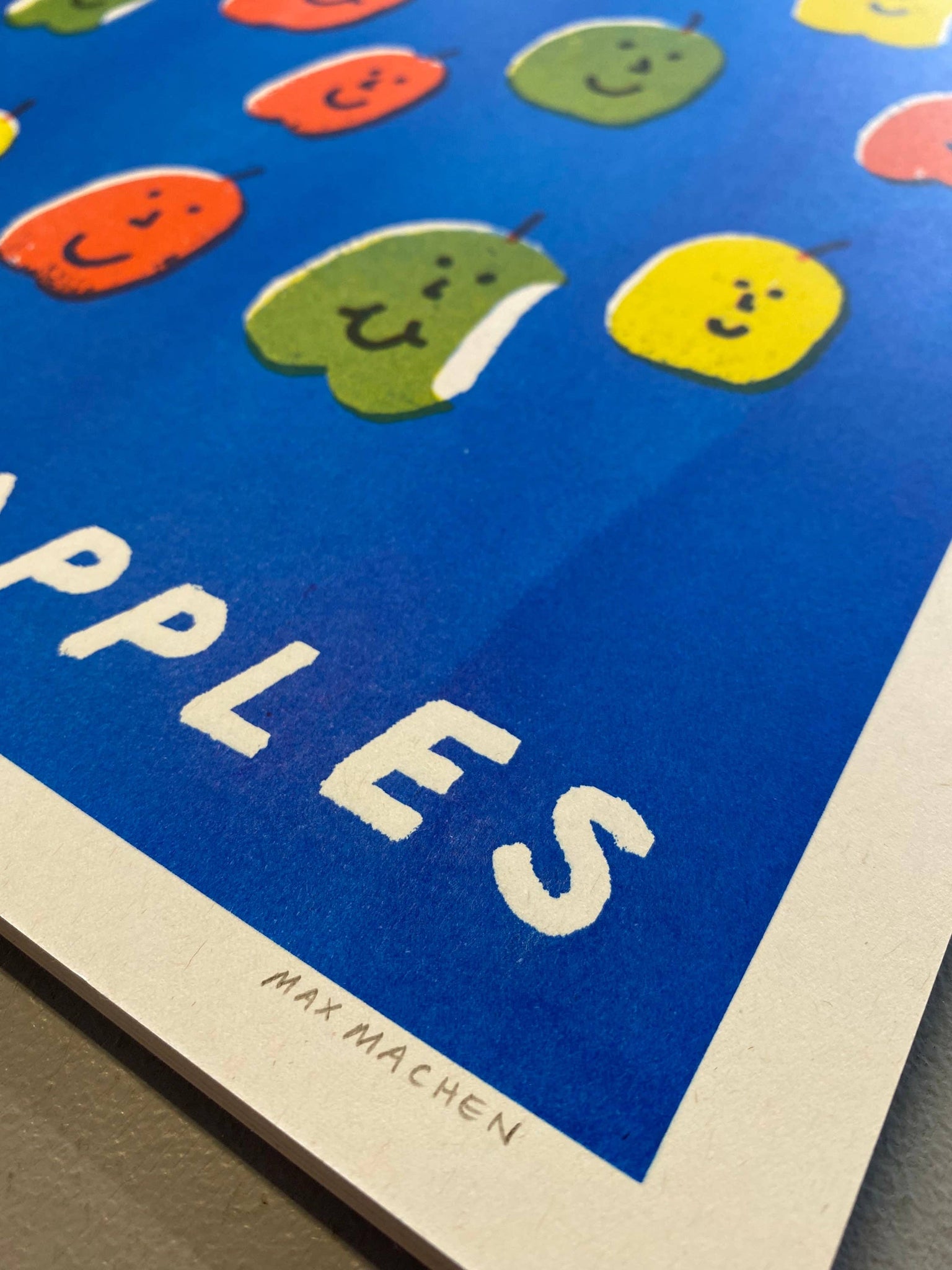 Some friendly apples to grin at you from the wall! This is a 3 colour A3 (297 x 420 mm) riso print on nice quality off white paper. Each print is signed in the bottom right. Thanks for looking!