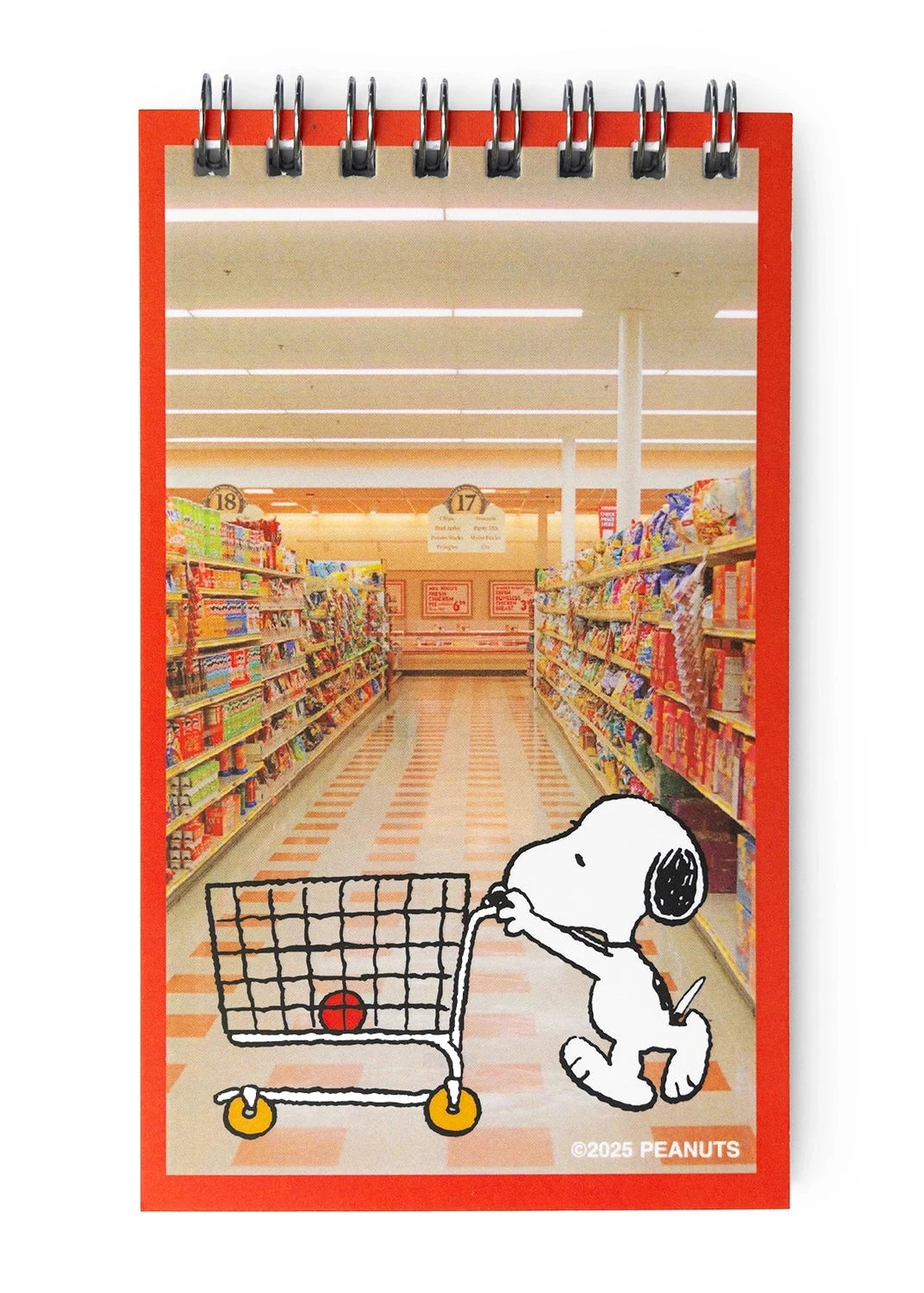 Meet your new favourite pocket pal - the Snoopy Grocery Mini Notebook. Channelling the charm of 1980s five-and-dime finds, this petite spiral-bound pad features stunningly detailed photo-realistic artwork paired with everyone's most endearing beagle in his element. Perfect for capturing grocery lists, quick reminders, or spontaneous doodles.