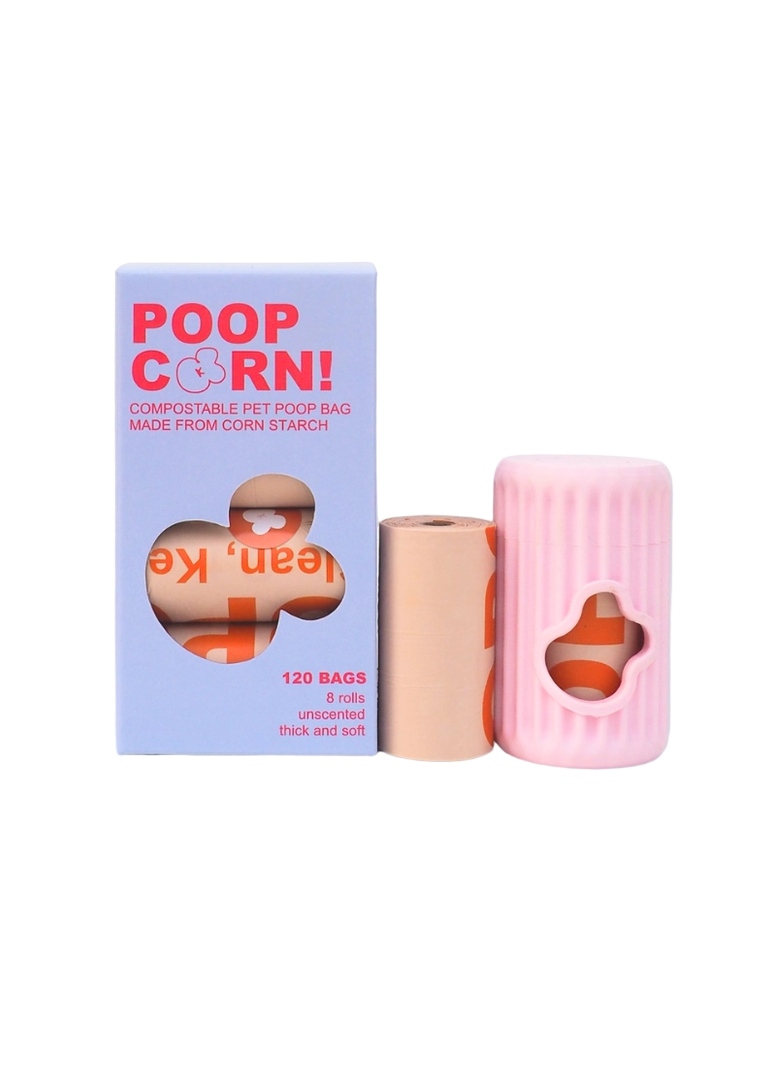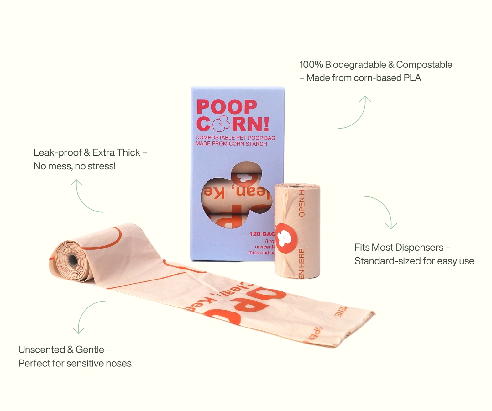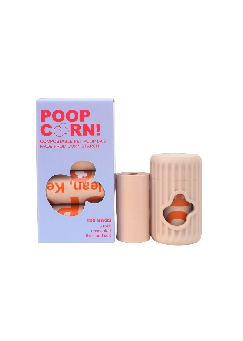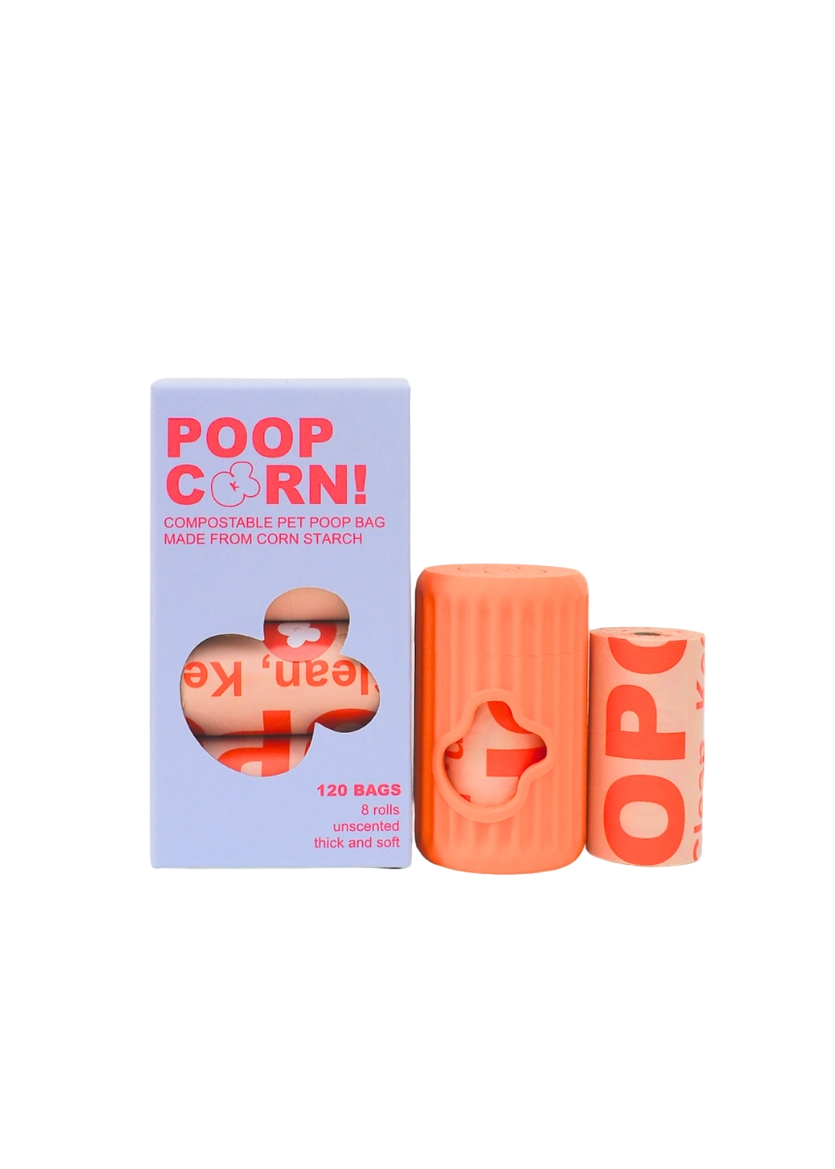 The Poopcorn Walk Set is the perfect present for pet owners who care about convenience and sustainability. This set includes a sleek 3D-printed Poopcorn Dispenser and a box (8 rolls) of Poopcorn compostable poop bags made from corn starch (hence the name :-)), designed to make clean-ups effortless and eco-friendly.
