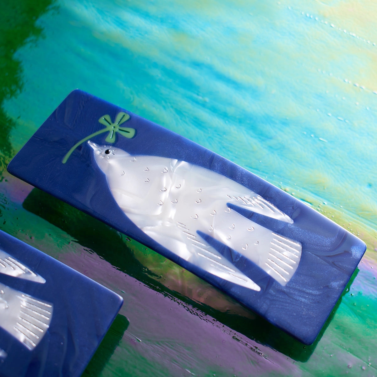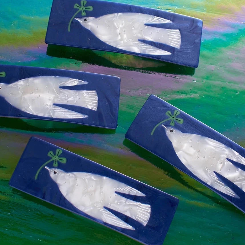 A sweet dove to bring you peace, happiness, and luck! This french barrette is full of detail - from silvery hand painted feathers, a sparkling black stone eye, and a perfect little four leaf clover.