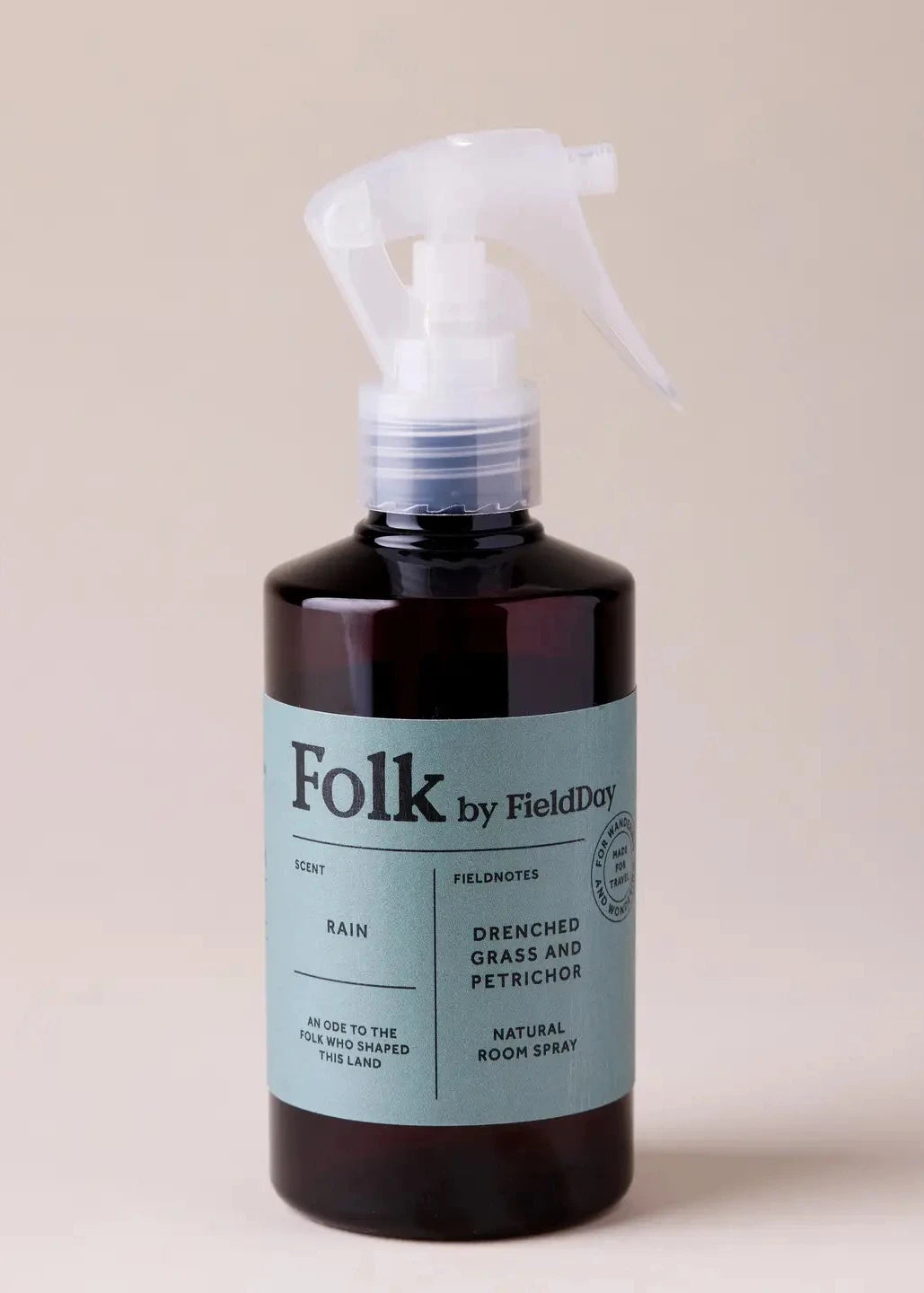 Drenched Grass and Petrichor Room Spray in amber bottle.