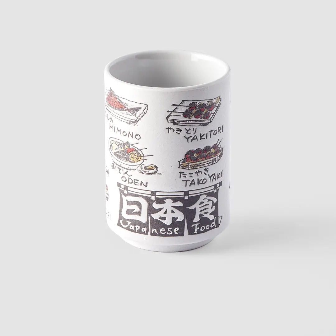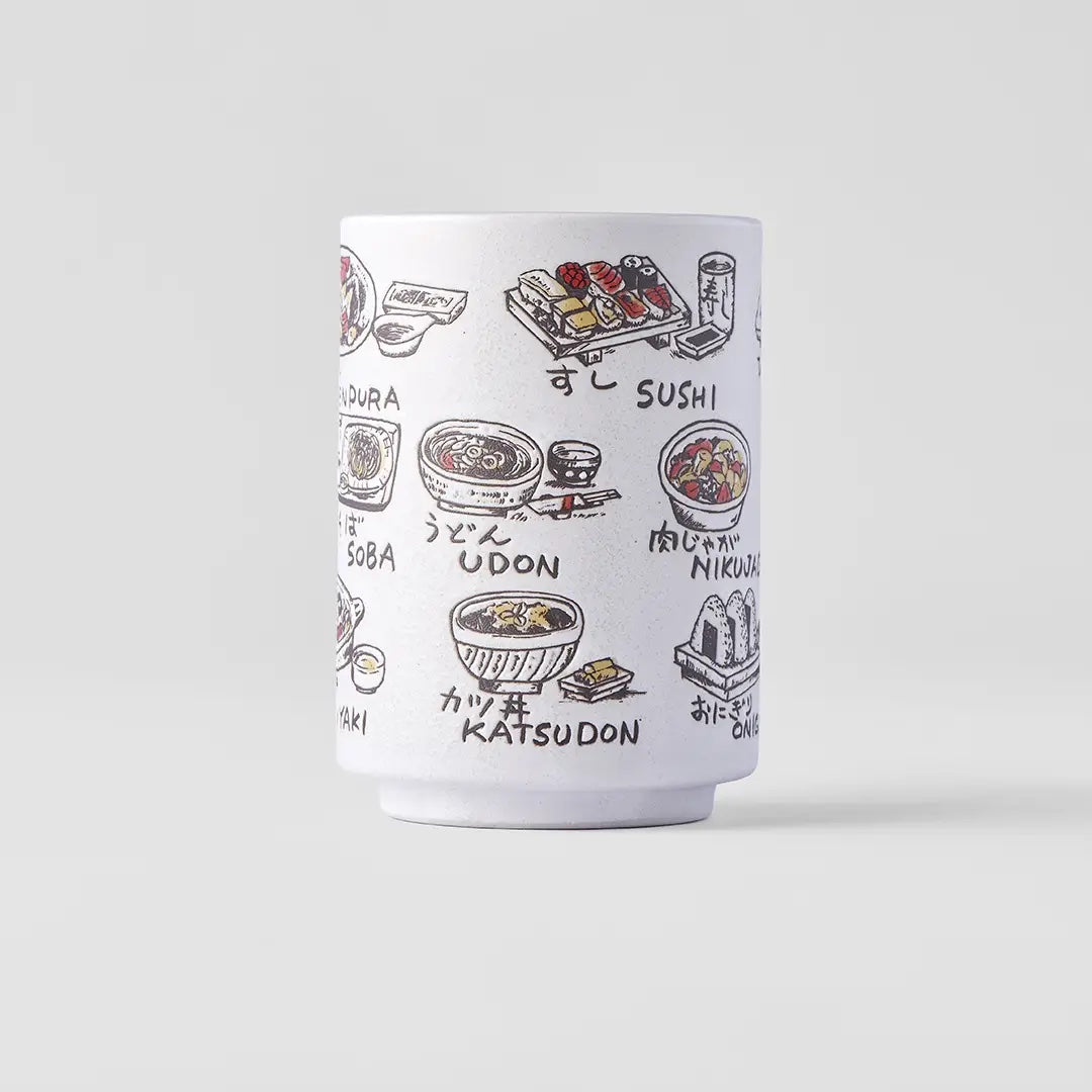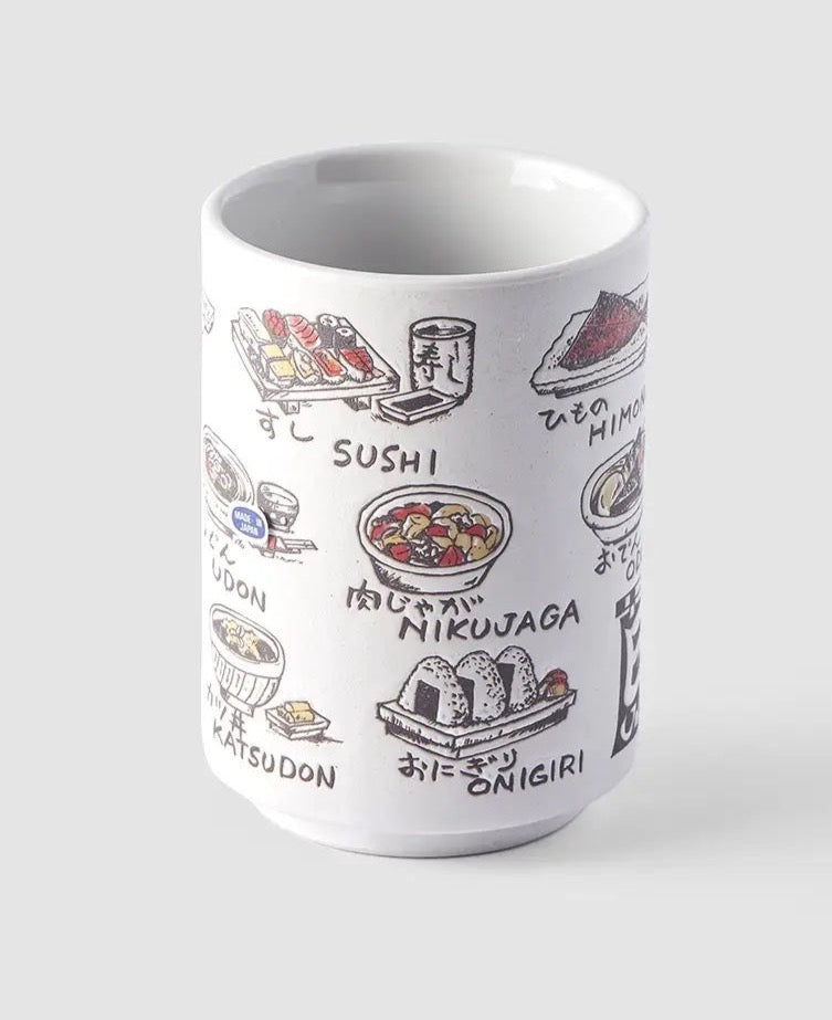 A Lovely Illustrated porcelain mug featuring designs of Japanese food. A perfect blend of functionality and style! This mug is a must-have for anyone who loves Japanese culture, or just wants a dose of good vibes for the morning coffee or your afternoon green tea.