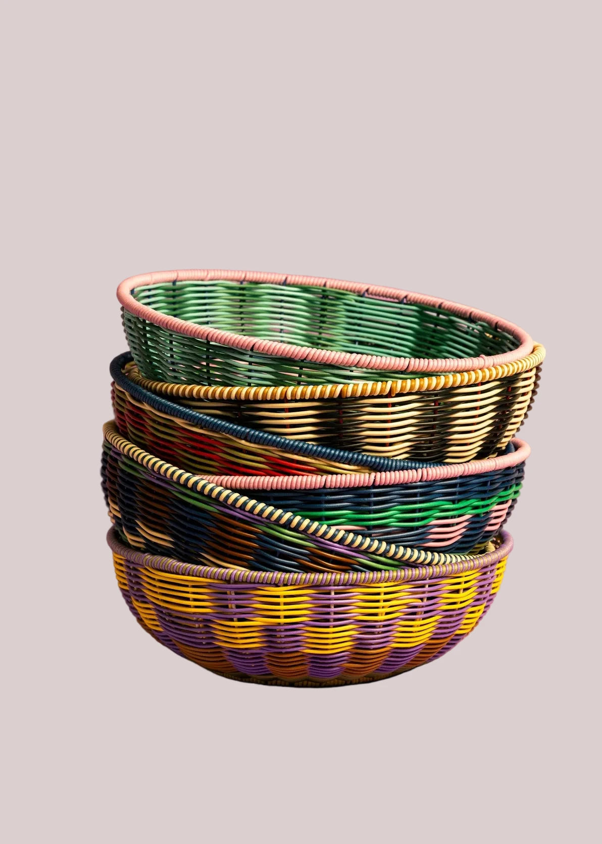 Each bowl is hand woven from coloured polypropylene, creating unique patterns that celebrate joyful design and everyday functionality. Generously sized and endlessly versatile, these bowls are perfect for serving bread, displaying fresh fruit, or storing household essentials in style.