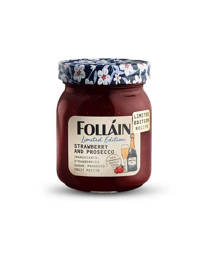 Strawberries 47%, Sugar, Prosecco 3%, Marc de Champagne, Gelling Agent: Fruit Pectin, Prepared with 47g of fruit per 100g & Sugar content 60g per 100g