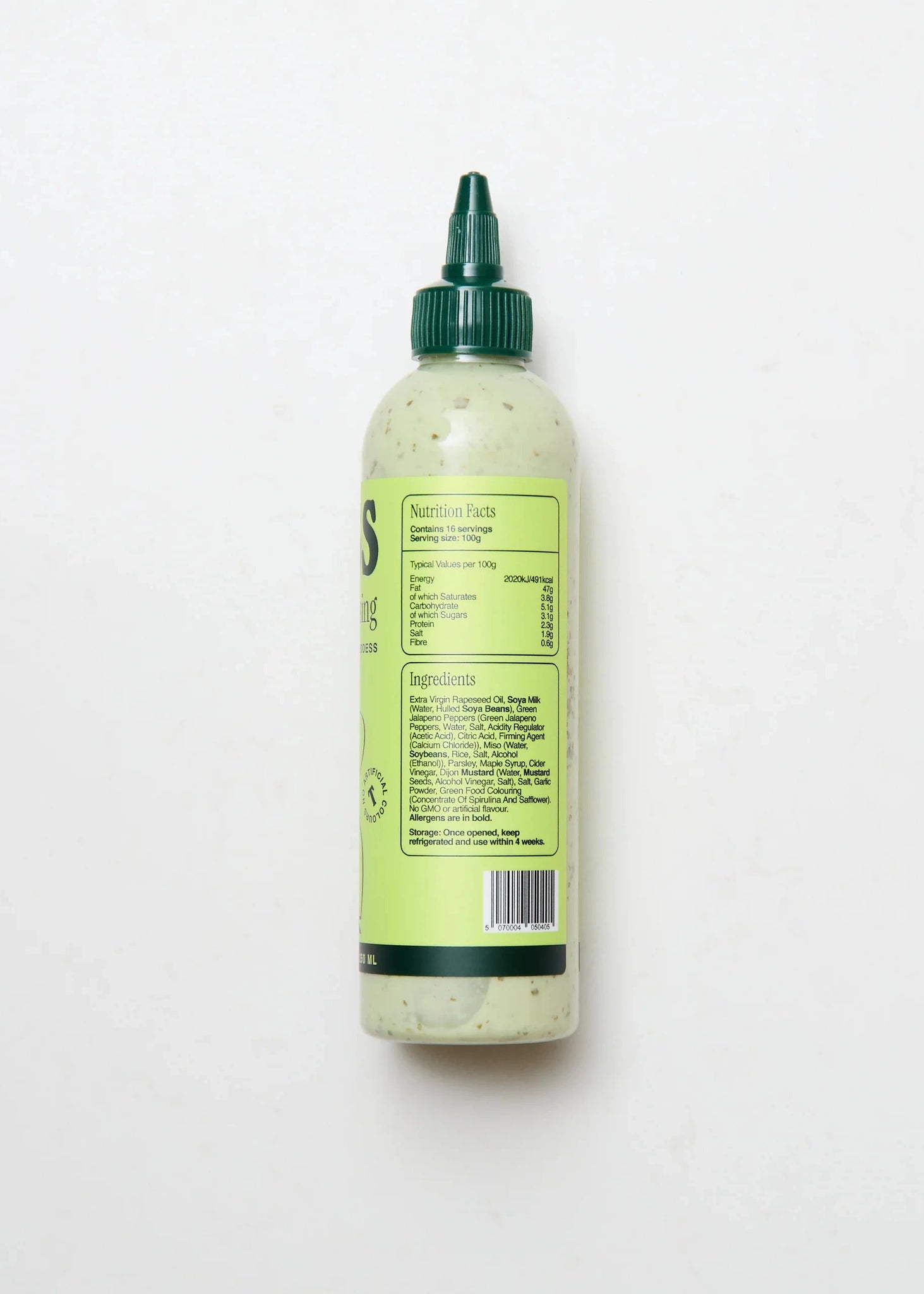 Ingredients: Extra Virgin Rapeseed Oil, Soya Milk (Water, Hulled Soya Beans), Green Jalapeno Peppers (Green Jalapeno Peppers, Water, Salt, Acidity Regulator (Acetic Acid), Citric Acid, Firming Agent (Calcium Chloride)), Miso (Water, Soybeans, Rice, Salt, Alcohol (Ethanol), Parsley, Maple Syrup, Cider Vinegar, Dijon Mustard (Water, Mustard Seeds, Alcohol Vinegar, Salt), Salt. SOYA MILK, SOYA BEANS, MUSTARD