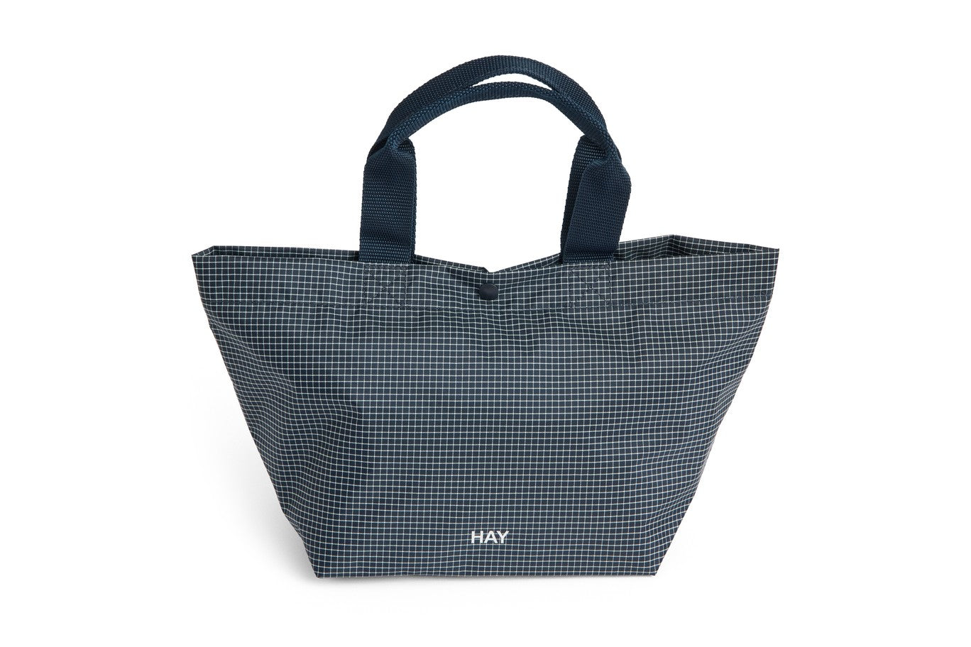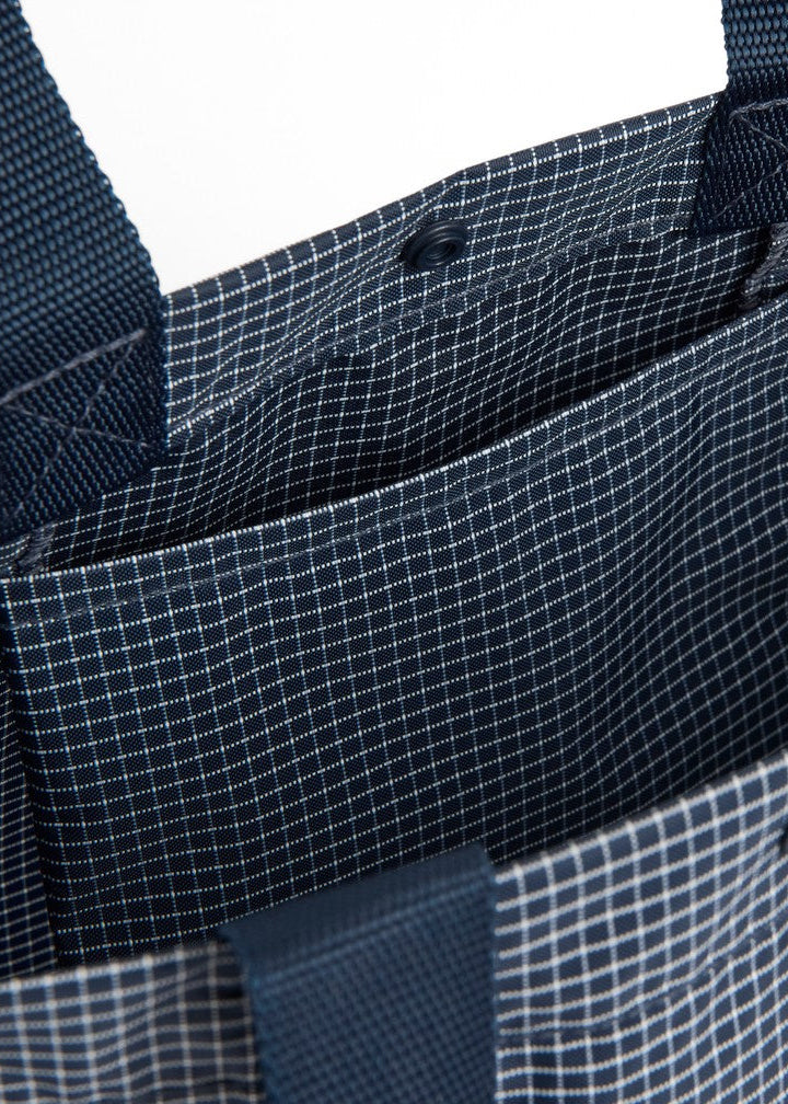 Made from a durable blend of 79% recycled nylon and 21% polyester with water-repellent finish, it features a subtle check pattern, press button fastening, and sturdy handles.