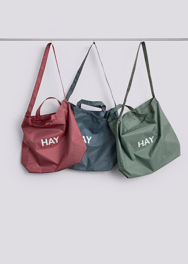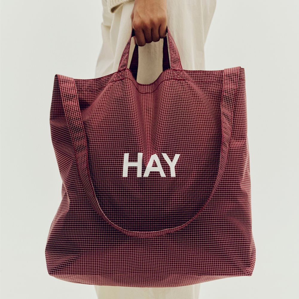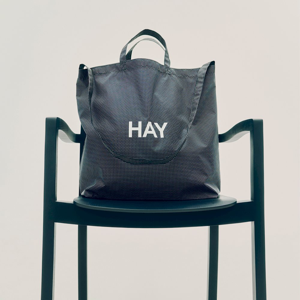 Made from a durable blend of 79% recycled nylon and 21% recycled polyester with a water-repellent finish, it features a subtle check pattern, long shoulder strap, two short handles, and an inner pocket for storing small essentials.