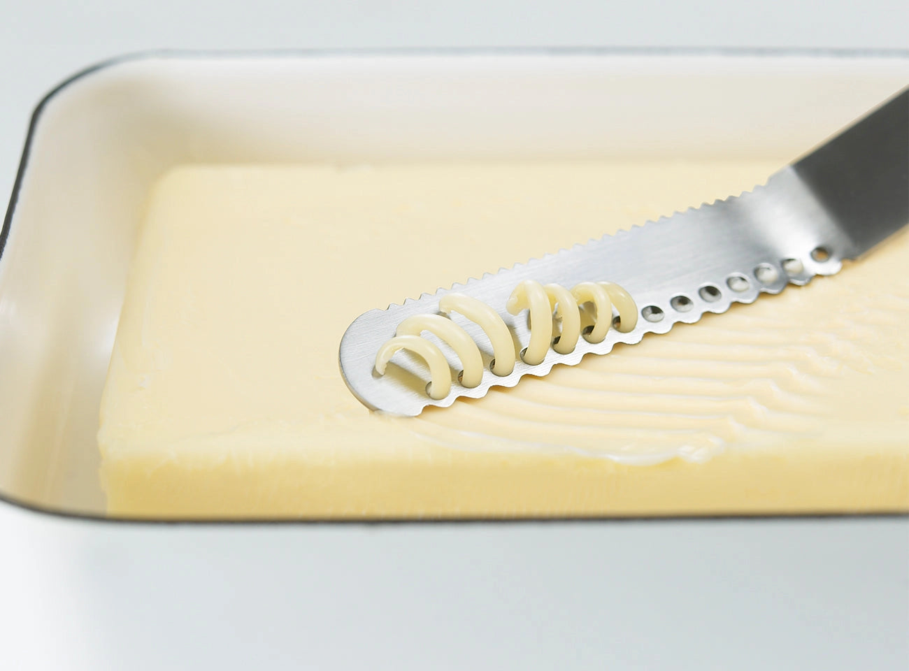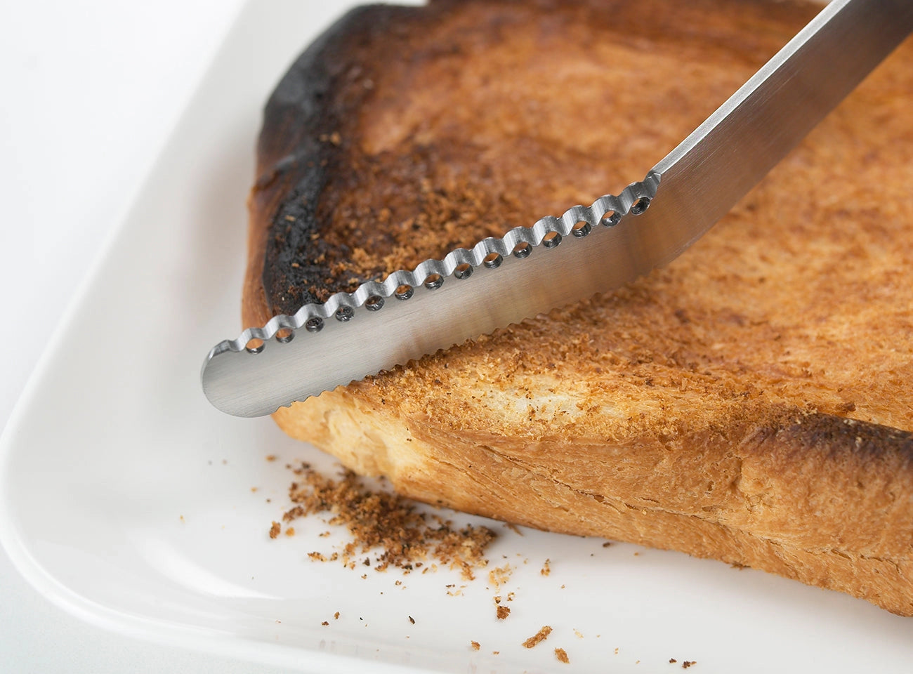 The small diagonal holes scrape hard butter into threads that can be spread as is. The serrated blade can be used to remove burnt bits.
