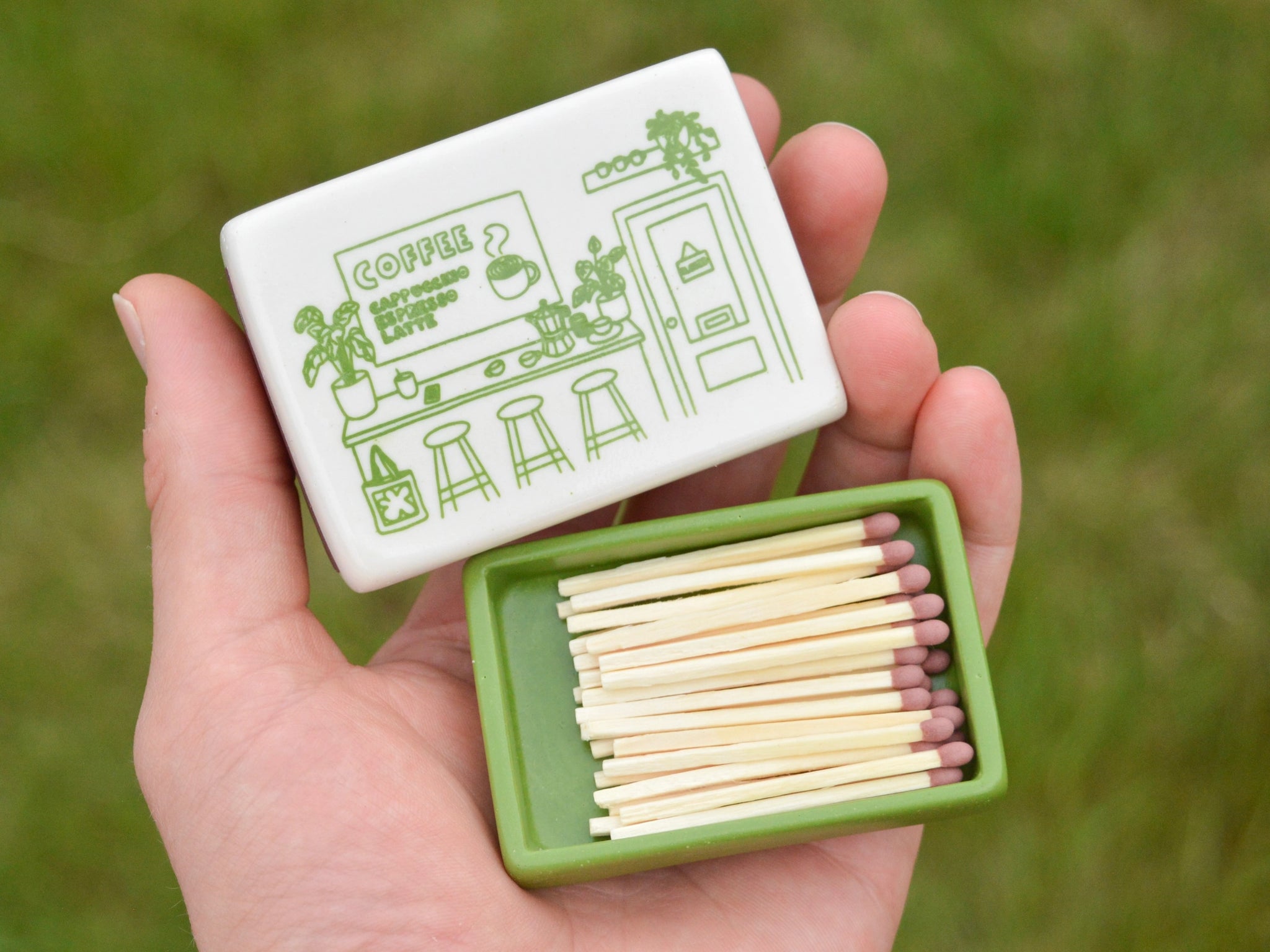 Handmade decorative matchbox with a green illustrated coffee shop design by Jake Thomas Parker.