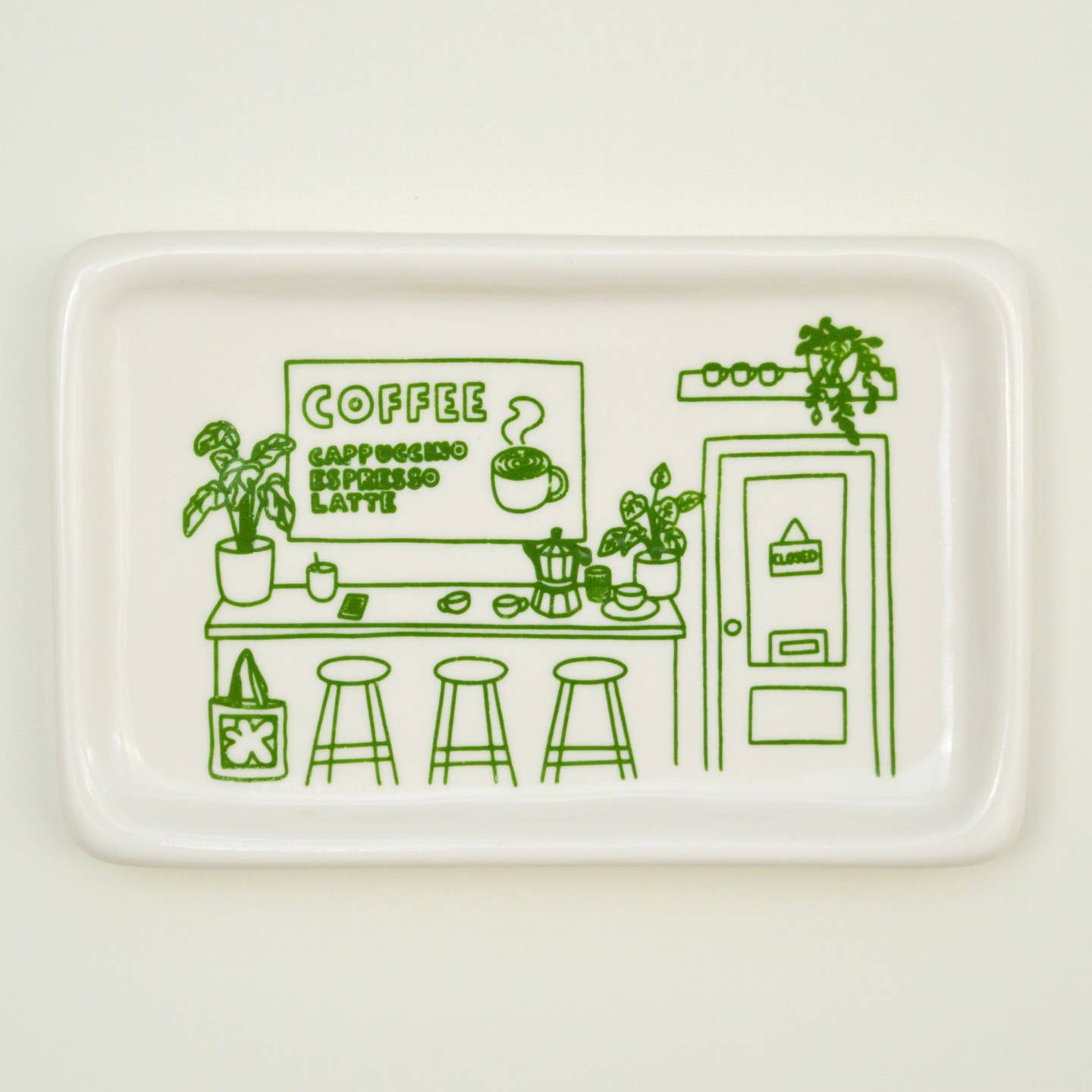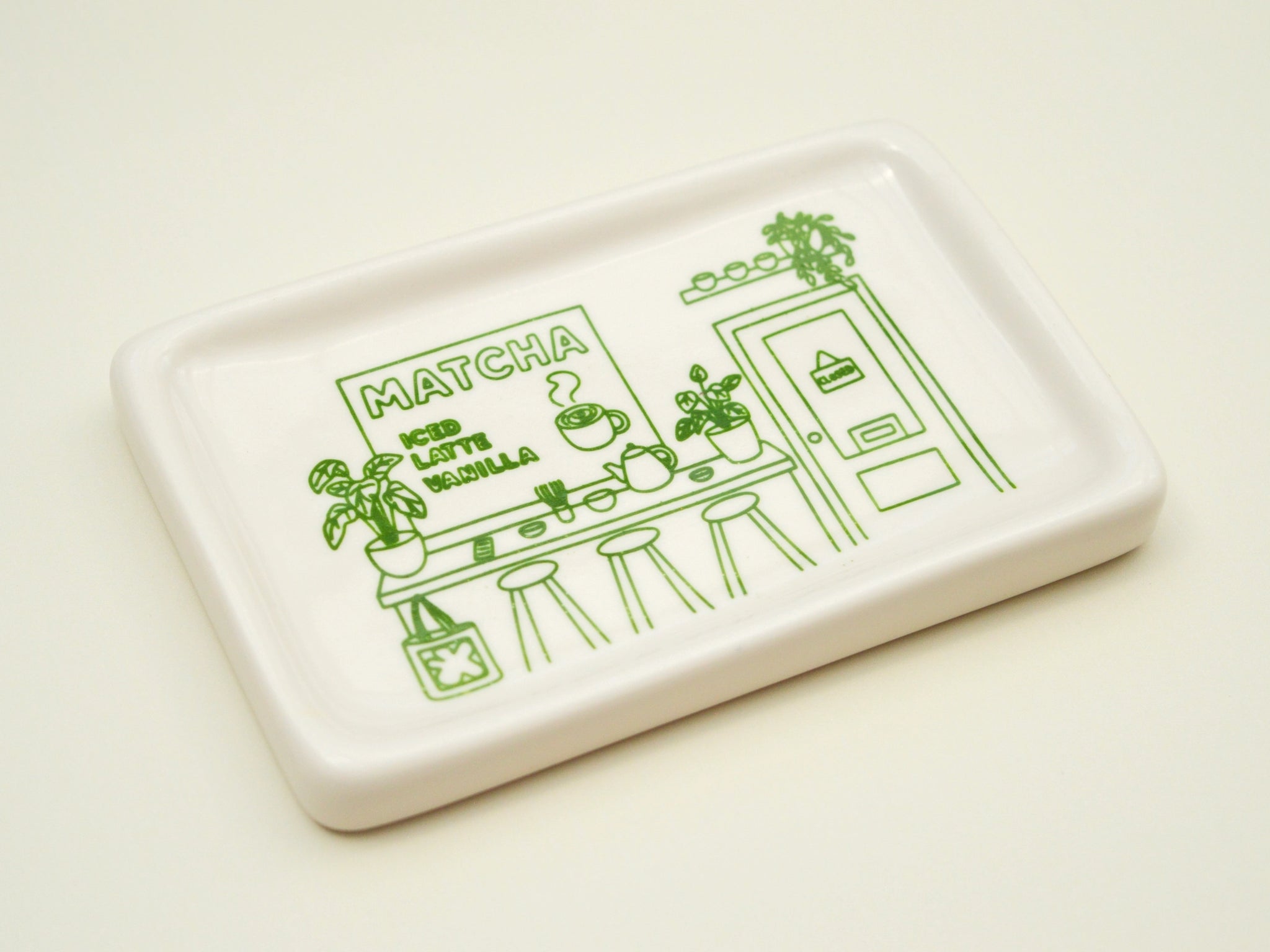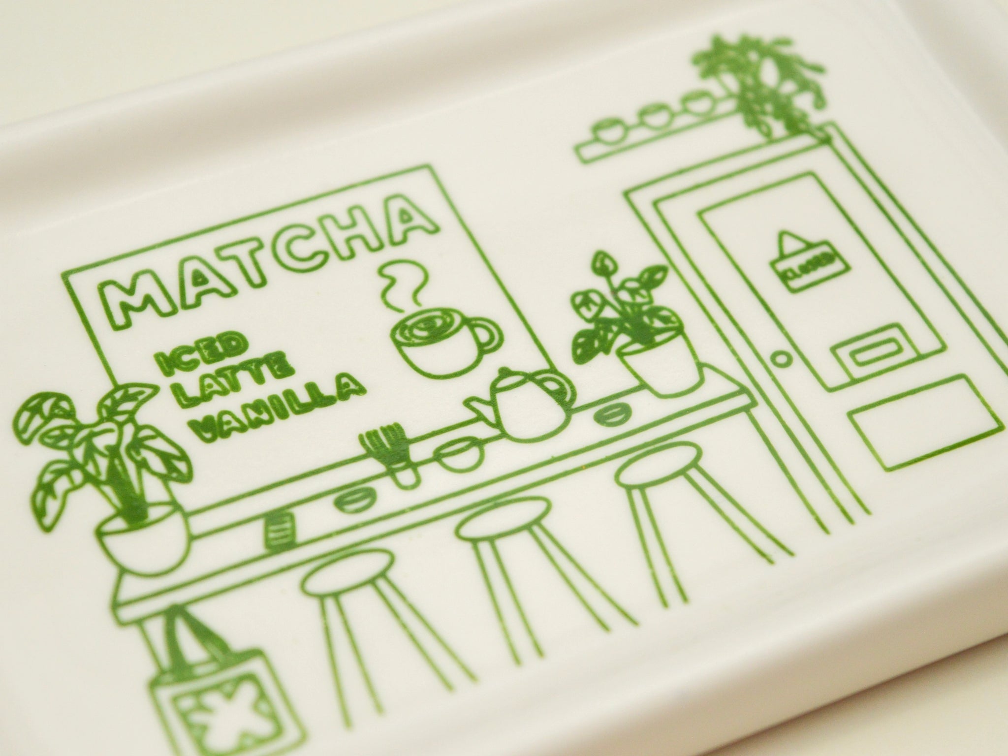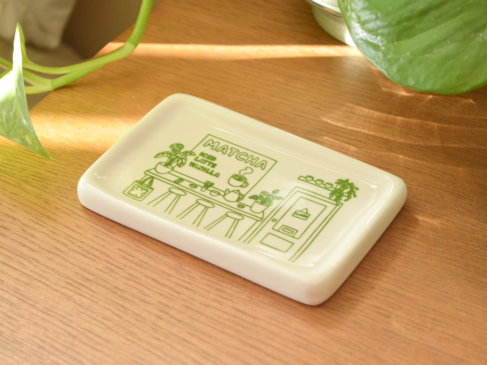 Hand sculpted trinket dish with a green matcha illustration by Jake Thomas Parker. Use as an ashtray, jewellery dish or simply as a decorative piece in your home.