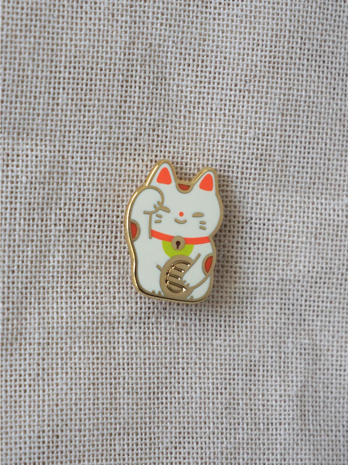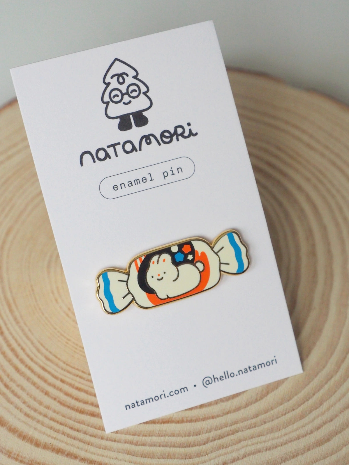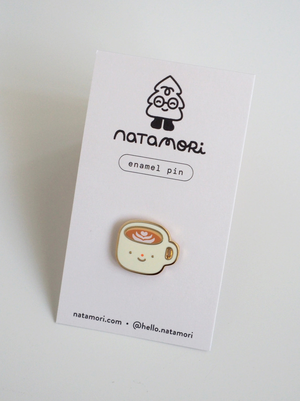 Natamori hard enamel pins in three designs. Gold plated with screen printed details.